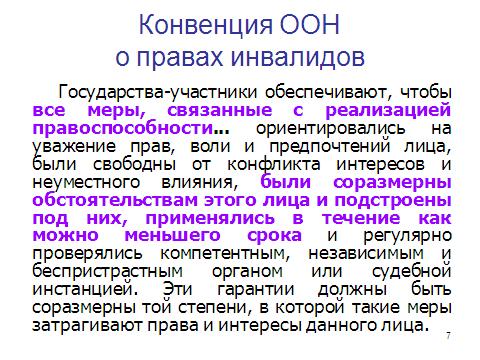 Перейдем к ратификации Российской Федерацией Конвенции ООН о правах инвалидов, которая произошла в 2012 году. Помимо всего прочего, эта Конвенция четко указывает, что государства-участники обязаны иметь гибкое законодательство, которое позволяет регулировать положение лиц с ментальной инвалидностью соразмерно существующим проблемам. Ограничение их прав и установление за ними контроля не должно быть избыточным и не должно приводить к их полному исключению из жизни и полной социальной дезадаптации.