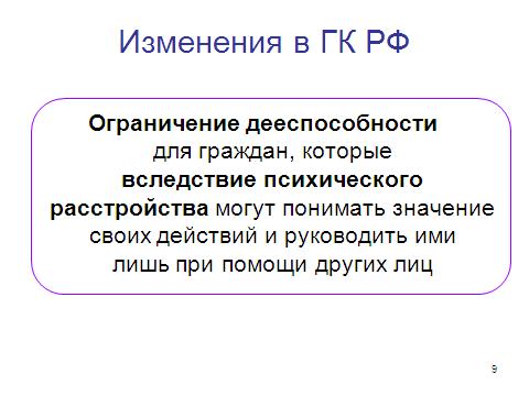 Со 2 марта у нас не только появляется институт ограниченной дееспособности, но и в институте недееспособности происходят изменения. Вносится это же положение – что опекун в отношении недееспособного тоже обязан заботиться о развитии или о восстановлении его способности понимать значение своих действий и руководить ими.