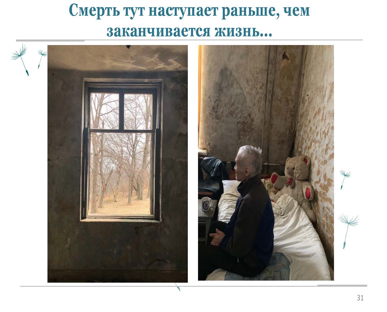 С проектом ОНФ «Регион заботы» я задалась целью найти всех, кто нуждается в паллиативной помощи. Многие из этих людей проживают в ДДИ, в ПНИ исключительно в отделениях милосердия. И на сегодняшний день я посетила очень много этих учреждений в 20 регионах страны из 25 пилотных. Вся моя презентация состоит из фотографий – с уважением к человеку, там не видно глаза, они не опознаны, все фото будут даваться без привязки к учреждениям и к субъектам. При этом я хотела бы подчеркнуть, что фотографии есть и московские, и Дальний Восток, и граница с Финляндией – то есть абсолютно от края до края. И да, когда я несколько раз написала в социальных сетях про хорошие ПНИ, то подверглась критике своих же коллег. Хороший ПНИ – это ПНИ, в котором директор нарушает все мыслимые нормы ради блага своих подопечных. Такие есть – их тех, которые я видела, таких два, это Буйнакск и Рыбинск.