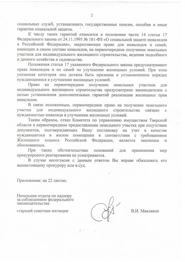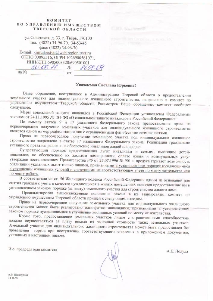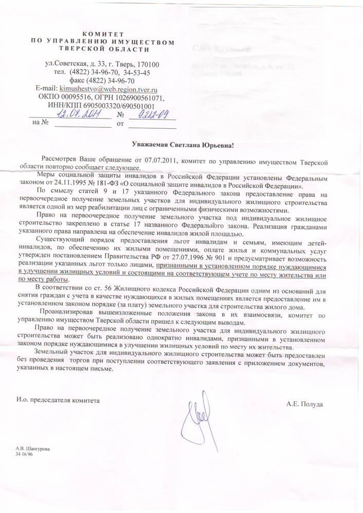 2) Законодательное Собрание Санкт-Петербурга принять закон, регламентирующий порядок предоставления земельных участков для инвалидов с учетом ФЗ «О социальной защите инвалидов в РФ» №181-ФЗ и Постановления Правительства от 27.07.1996г. № 901 «О предоставлении льгот инвалидам и семьям, имеющим детей-инвалидов, по обеспечению их жилыми помещениями, оплате жилья и коммунальных услуг».