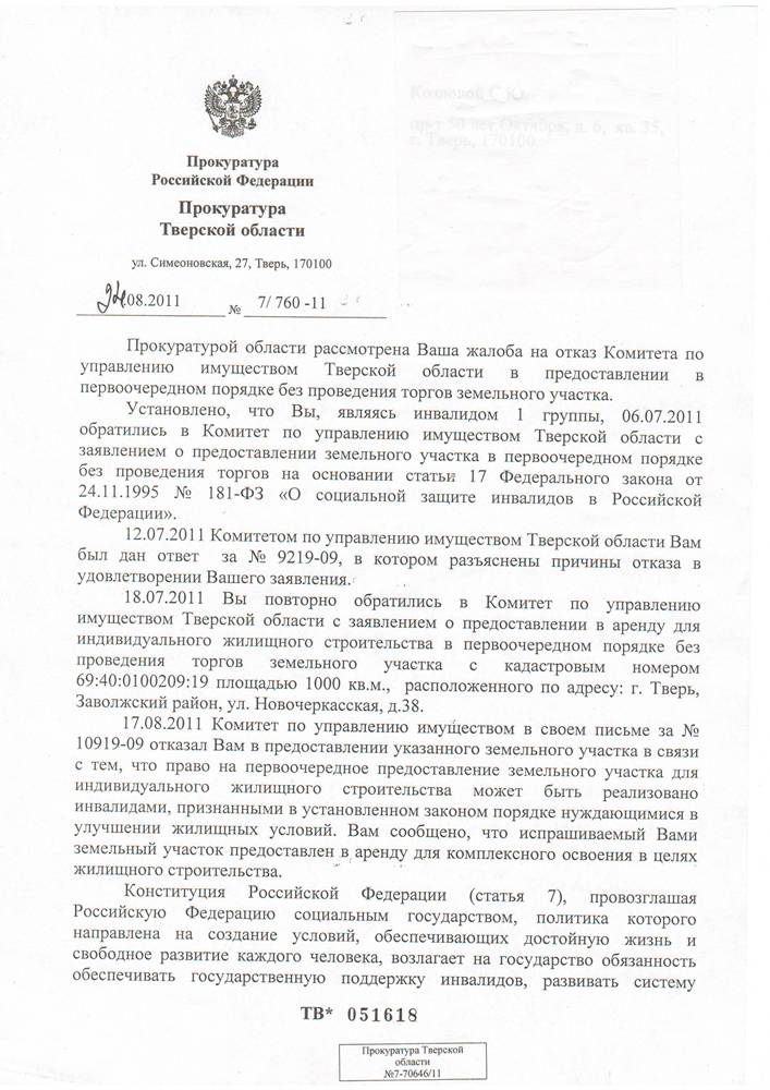 Выкладываю копии ответов Комитета по имуществу и Прокуратуры,может юристы подскажете как правильно подать иск в суд?Нужно указывать конкретный участок ,выставленный на сайте администрации?Хотя мне кажется,что если даже его указать,то пока идут суды,они этот участок кому-нибудь отдадут.Я в своем заявлении на выделение участка конкретно написала данные на участок,который был выставлен на продажу,но пока они мне отвечали(20дней) и Прокуратура писала свои "комментарии" они его быстренько" пристроили".И как потом доказать,что на момент подачи иска этот участок был свободен?P.S Второй лист ответа Прокуратуры выложу завтра,плохо отсканирован...